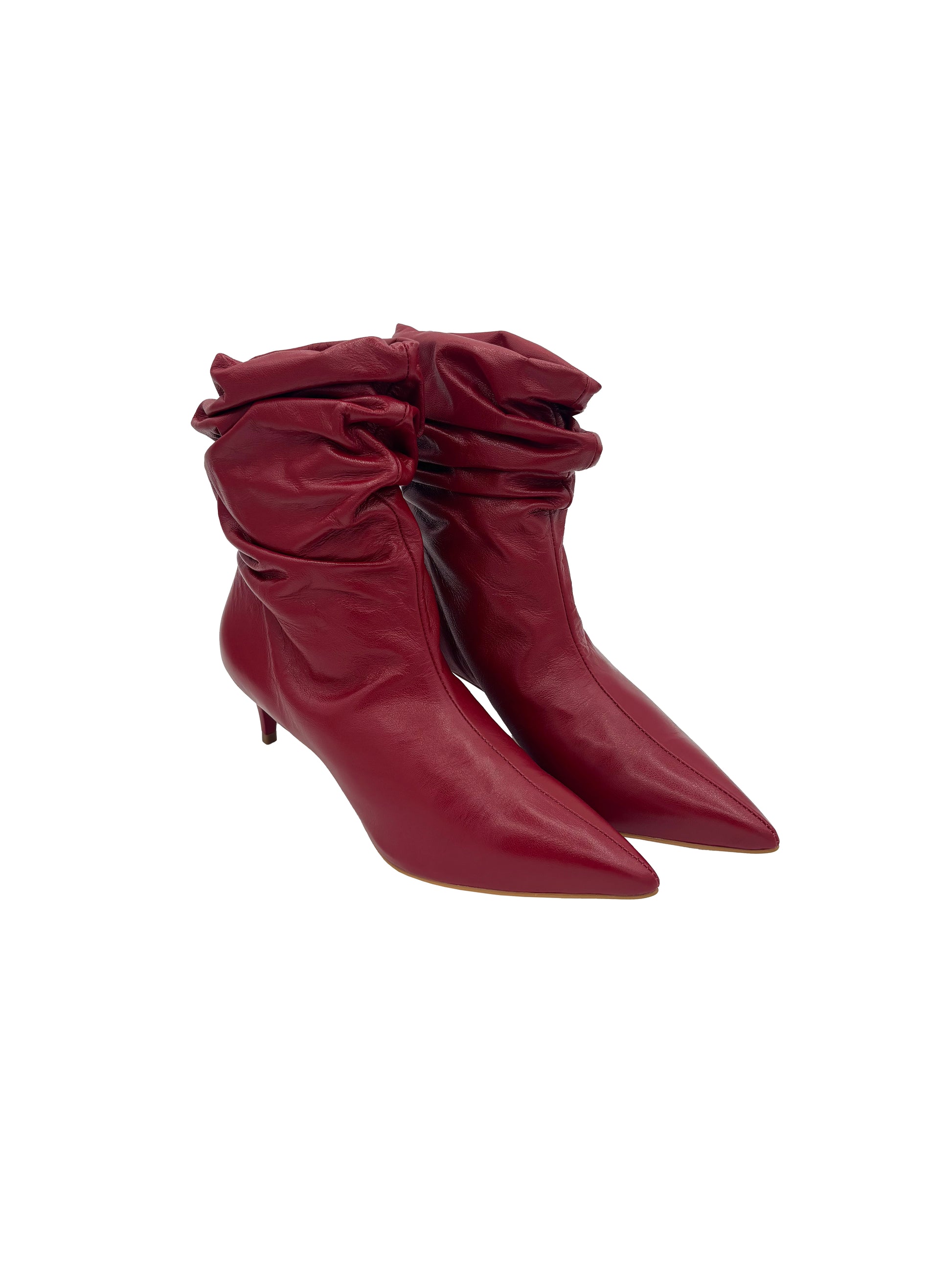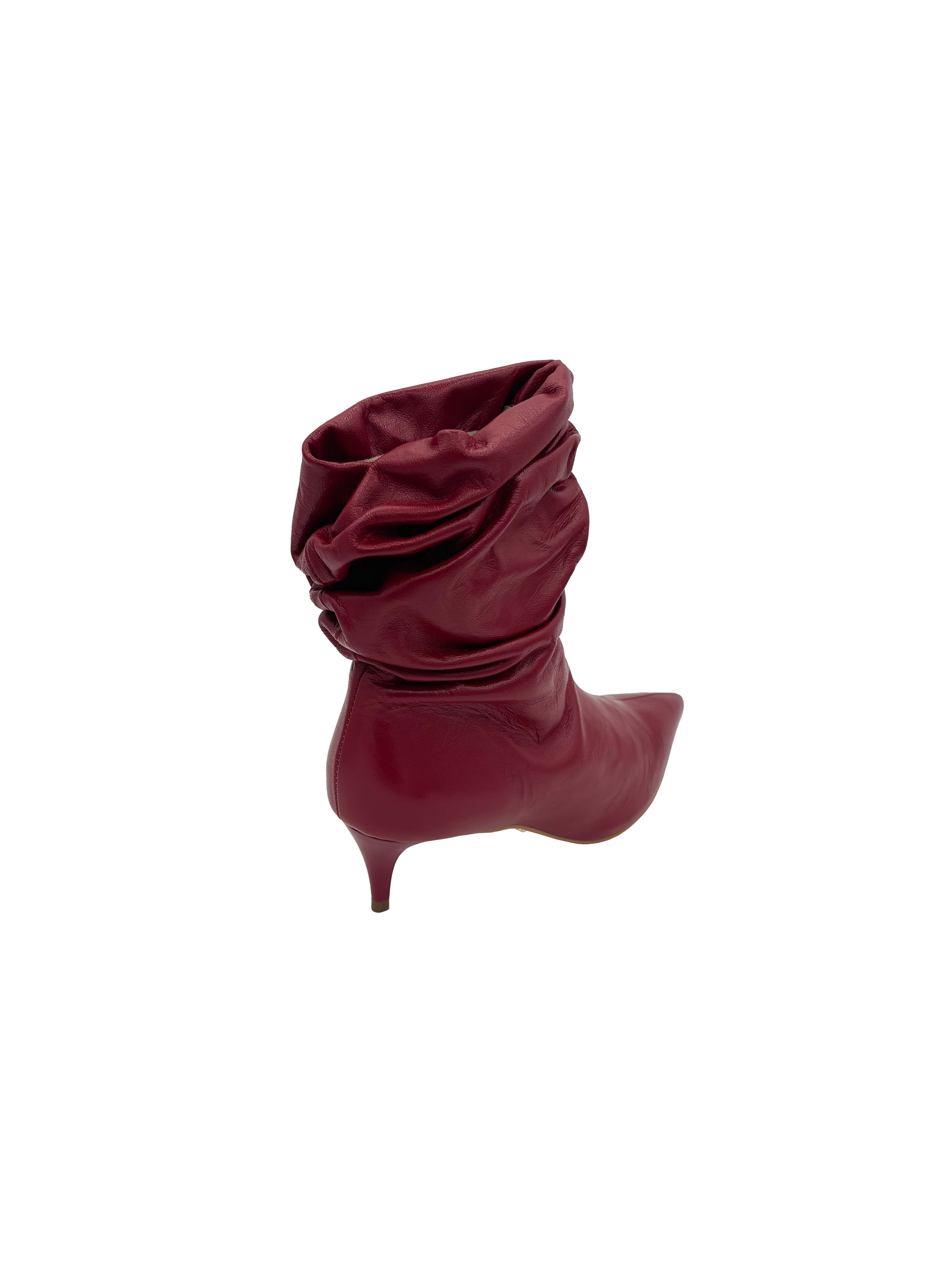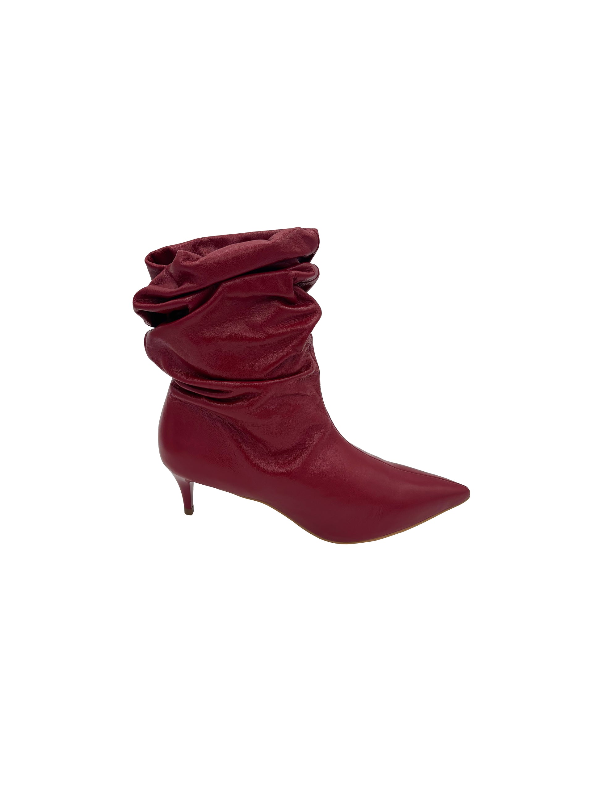 Stivaletto in pelle rossa con gambale arricciato e tacco sottile.