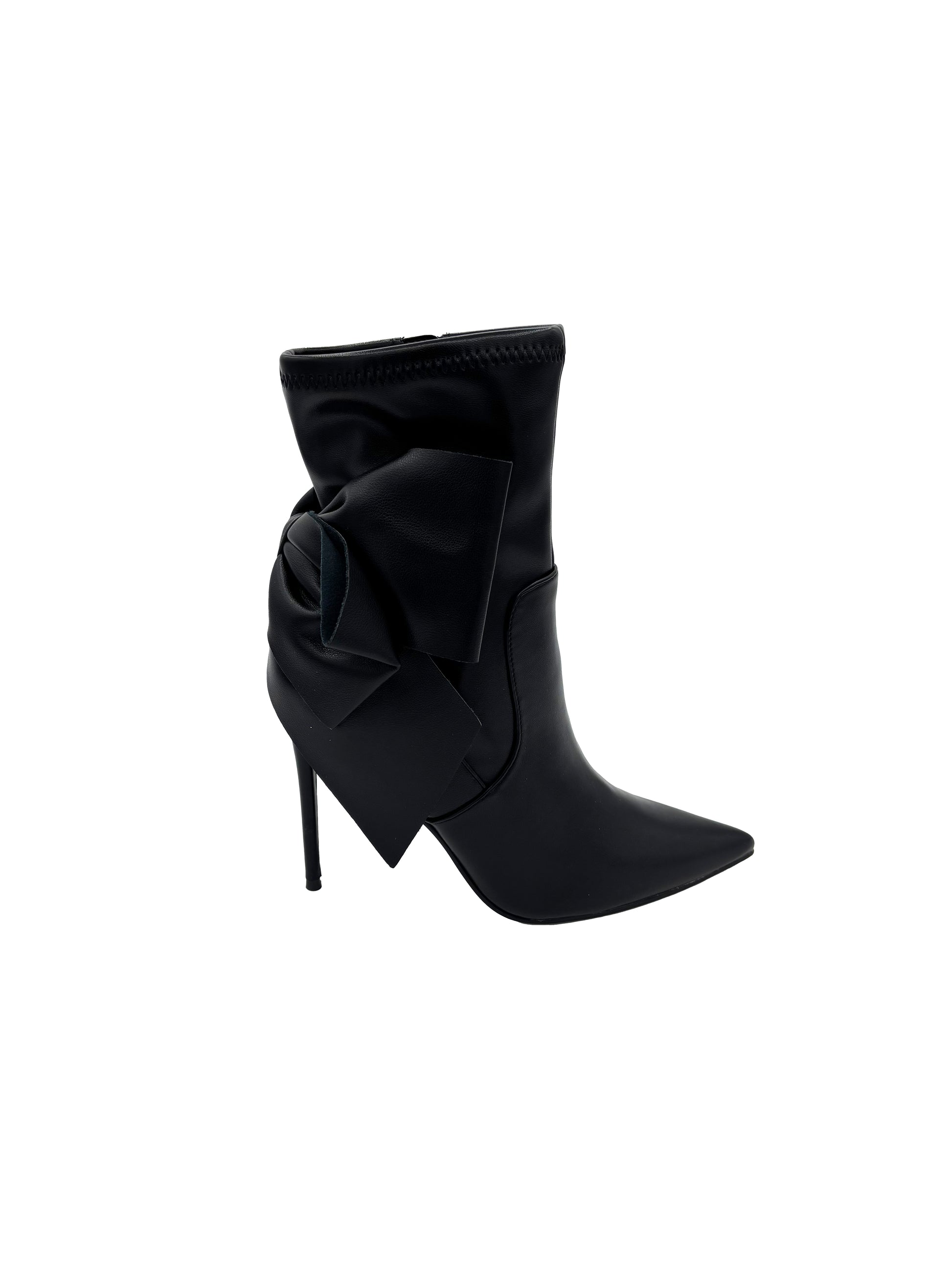 Stivaletto in pelle nera con fiocco posteriore e con tacco sottile.