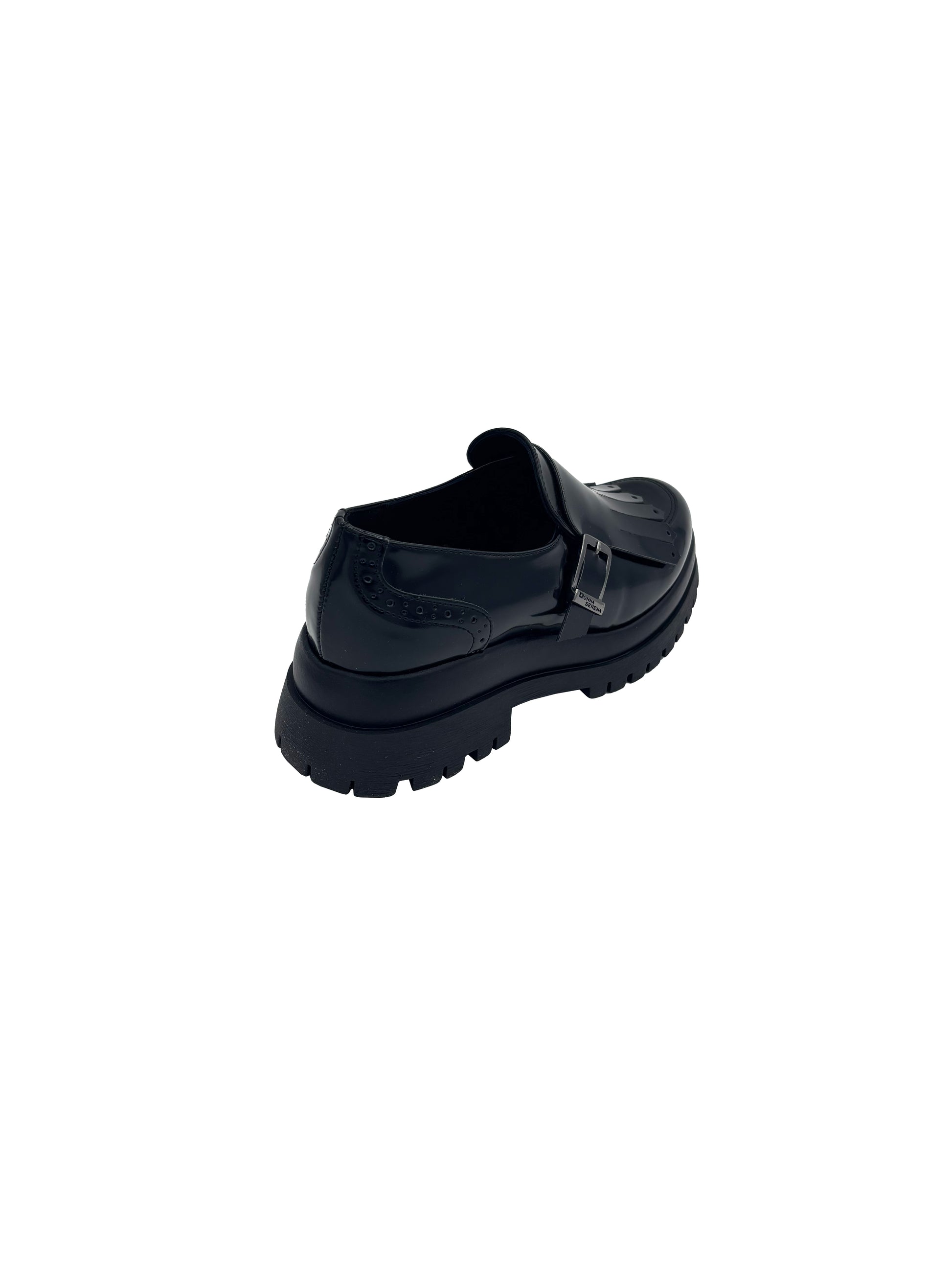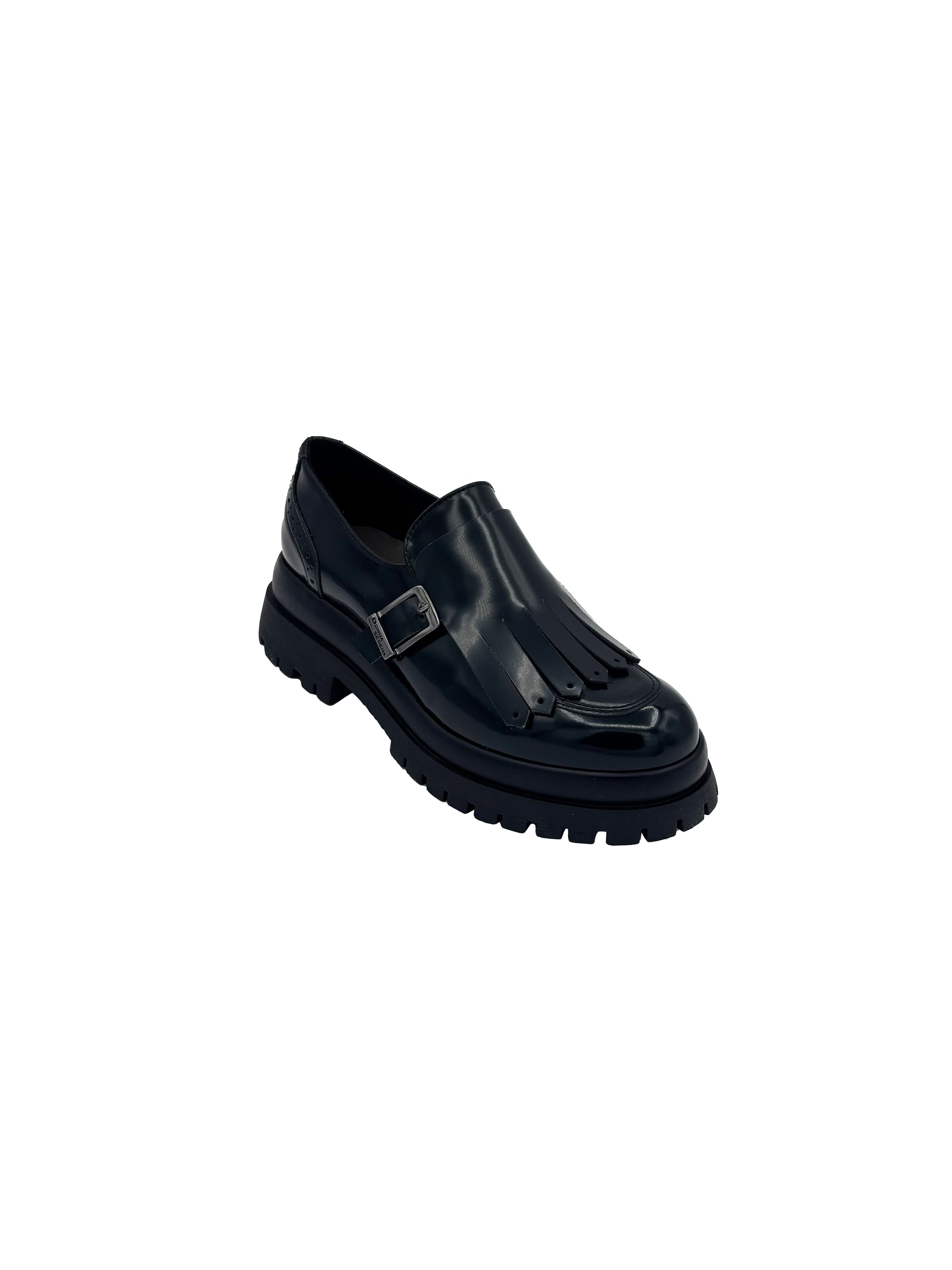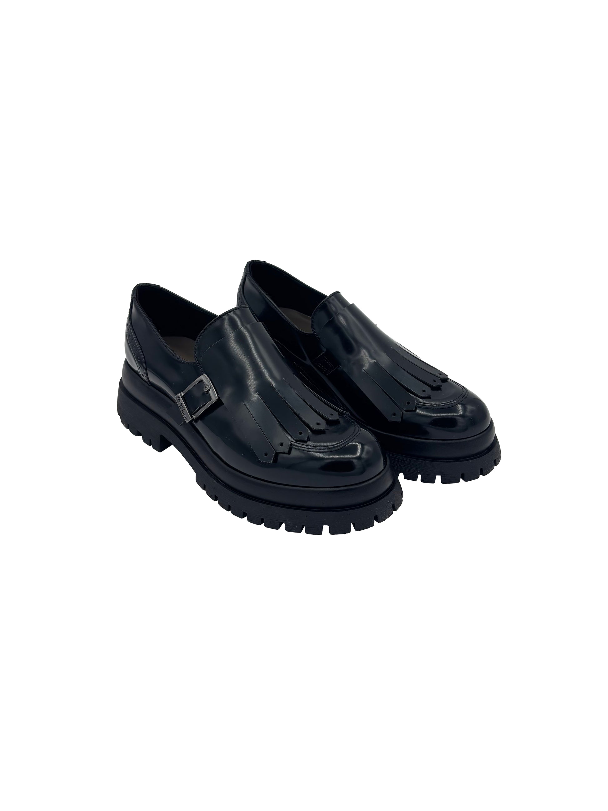 Scarpa slip-on in pelle nera lucida con frange e fibbia argentata spazzolata.