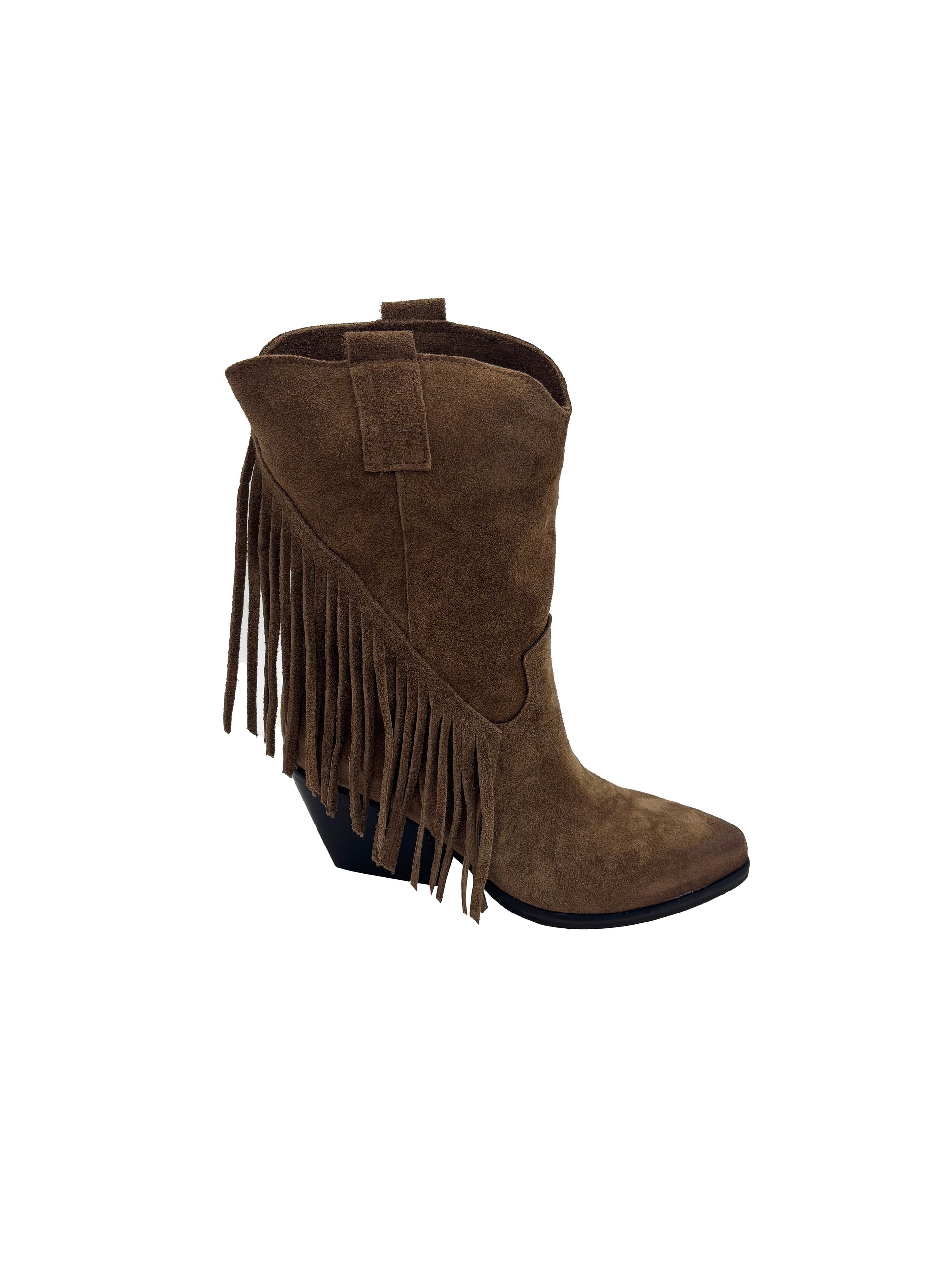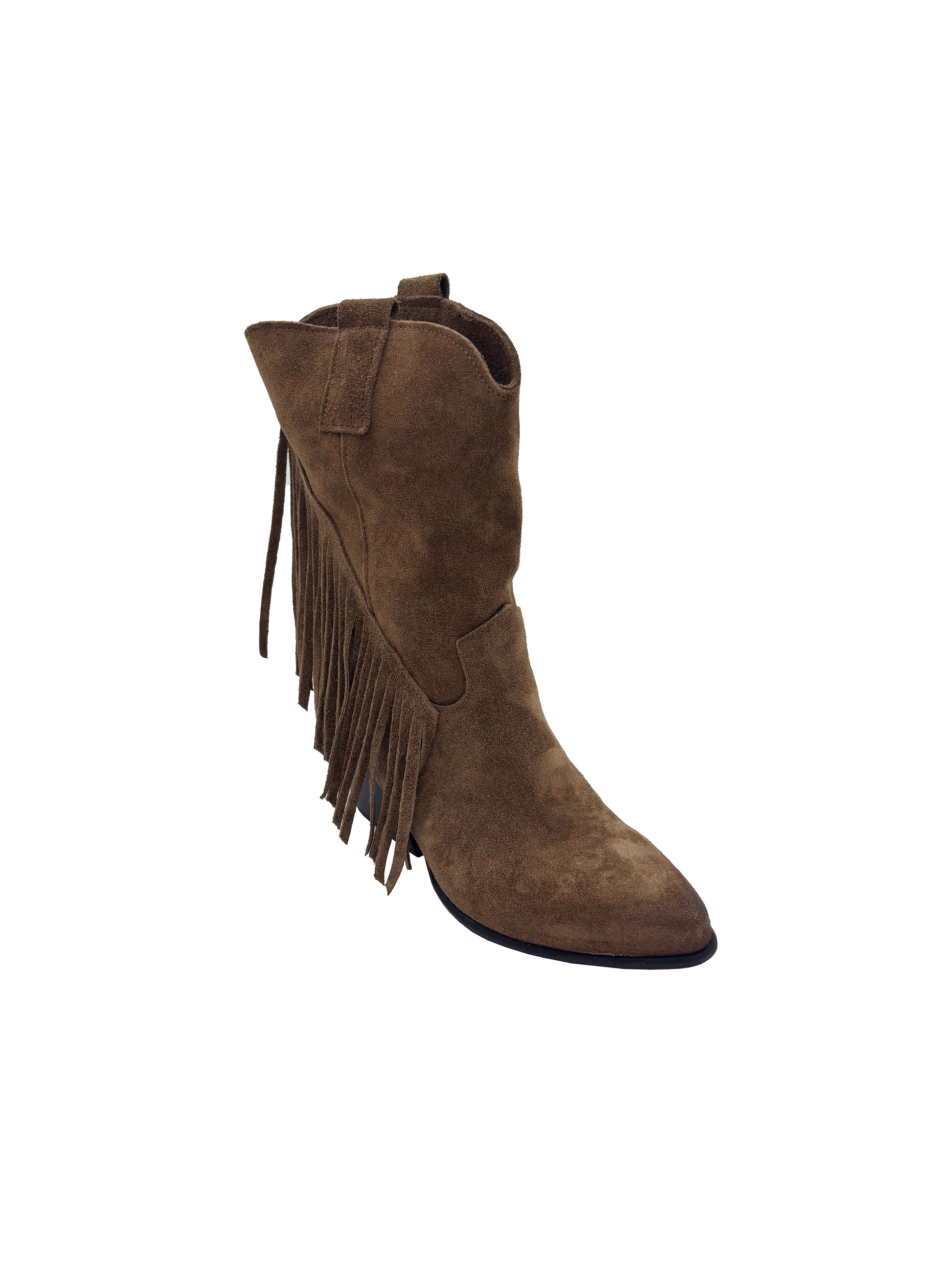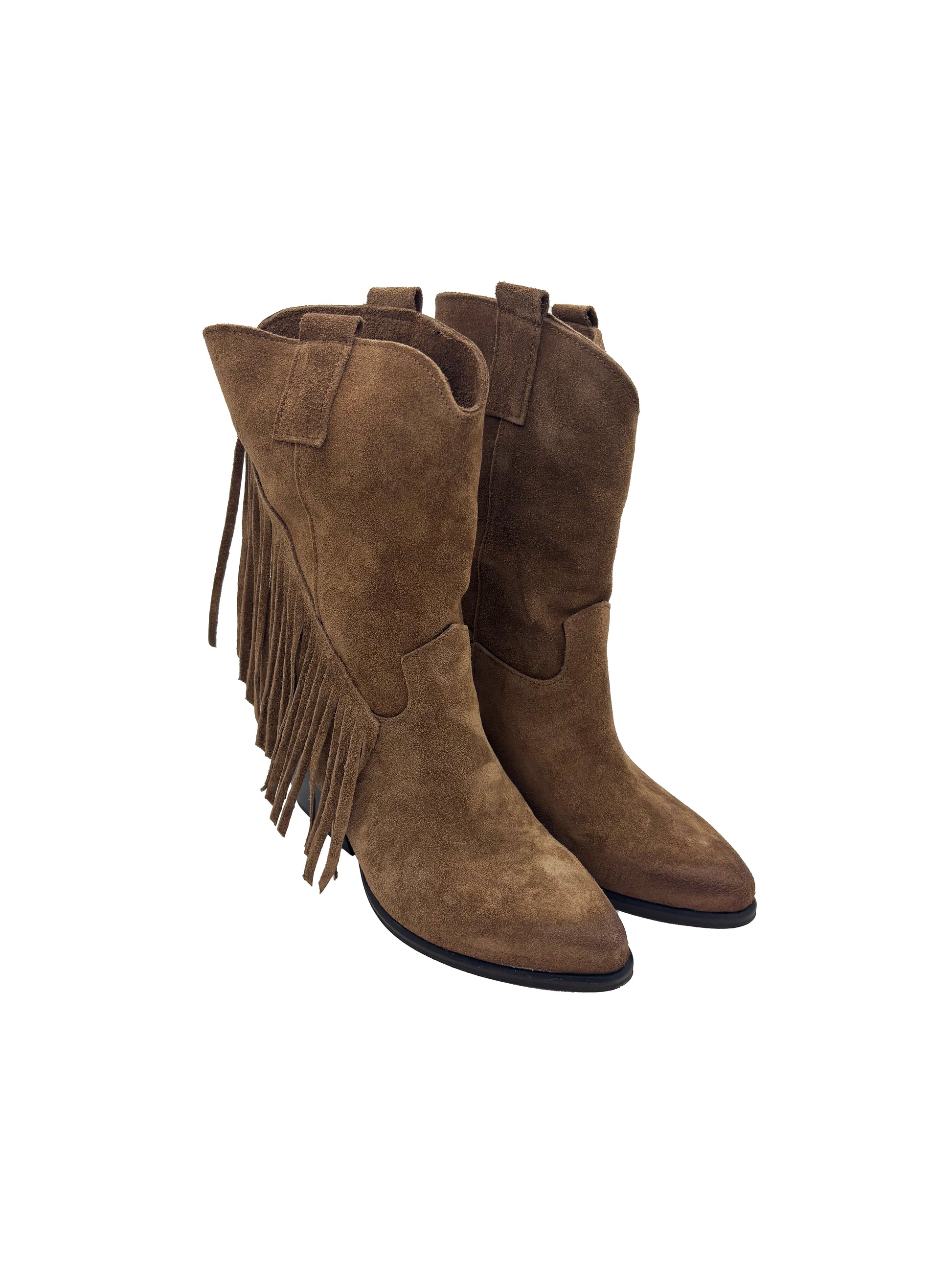 Stivale artigianale texano in camoscio con frange e tacco grosso.